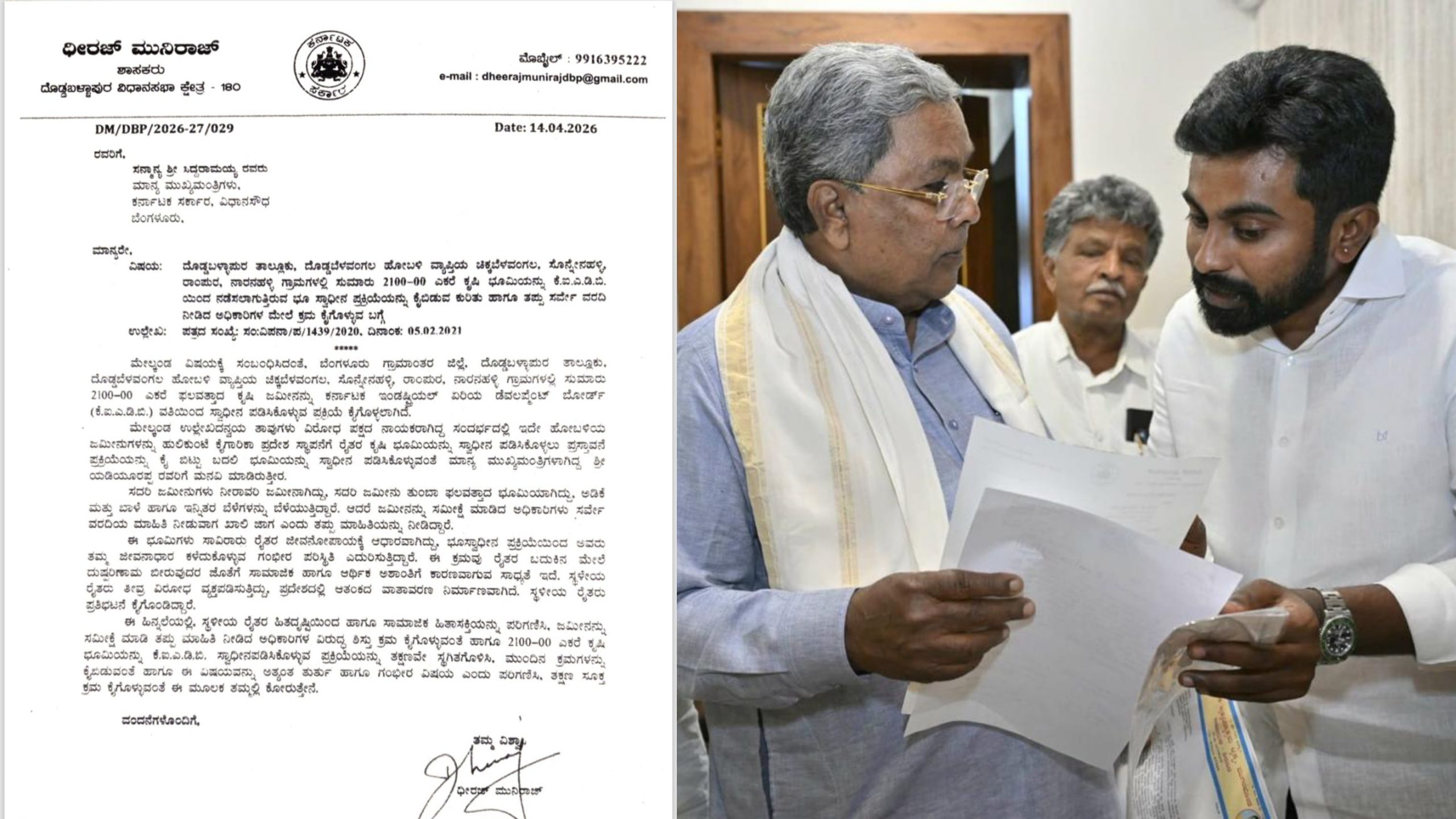 ಮುಖ್ಯಮಂತ್ರಿ ಸಿದ್ದರಾಮಯ್ಯ ಭೇಟಿ ಮಾಡಿ 2100 ಎಕರೆ ಕೃಷಿ ಜಮೀನು ಭೂಸ್ವಾಧೀನದಿಂದ ಕೈಬಿಡುವಂತೆ ಮನವಿ ಮಾಡಿದ ಶಾಸಕ ಧೀರಜ್ ಮುನಿರಾಜು