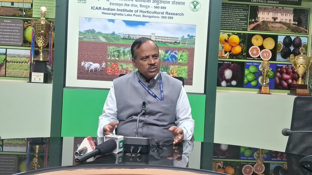 ಹೆಸರಘಟ್ಟದಲ್ಲಿರುವ ಭಾರತೀಯ ತೋಟಗಾರಿಕೆ ಸಂಶೋಧನಾ ಸಂಸ್ಥೆಯ (ICAR-IIHR) ಸಭಾಂಗಣದಲ್ಲಿ ನಡೆದ ಮಾಧ್ಯಗೋಷ್ಠಿಯಲ್ಲಿ ಮಾತನಾಡಿದ ಅವರು, ‘ವಿಕಸಿತ ತೋಟಗಾರಿಕೆ ಭಾರತಕ್ಕಾಗಿ ಪೋಷಣೆ, ಸಬಲೀಕರಣ ಮತ್ತು ಜೀವನೋಪಾಯ’ ಶೀರ್ಷಿಕೆ ಅಡಿಯಲ್ಲಿ ಉತ್ತಮ ಪೌಷ್ಟಿಕಾಂಶಯುತ್ತ ಬೆಳೆ ಬೆಳೆಯುವ ತಂತ್ರಜ್ಞಾನ, ಹೊಸ ತಳಿಗಳು, ಮೌಲ್ಯವರ್ಧಿತ ಉತ್ಪನ್ನಗಳ ಪ್ರದರ್ಶನ ಸೇರಿದಂತೆ ತೋಟಗಾರಿಕೆ ಕ್ಷೇತ್ರದ ಹಲವು ಸಂಶೋಧನೆಗಳು ಮೇಳದಲ್ಲಿ ಅನಾವರಣಗೊಳ್ಳಲಿವೆ ಎಂದರು.