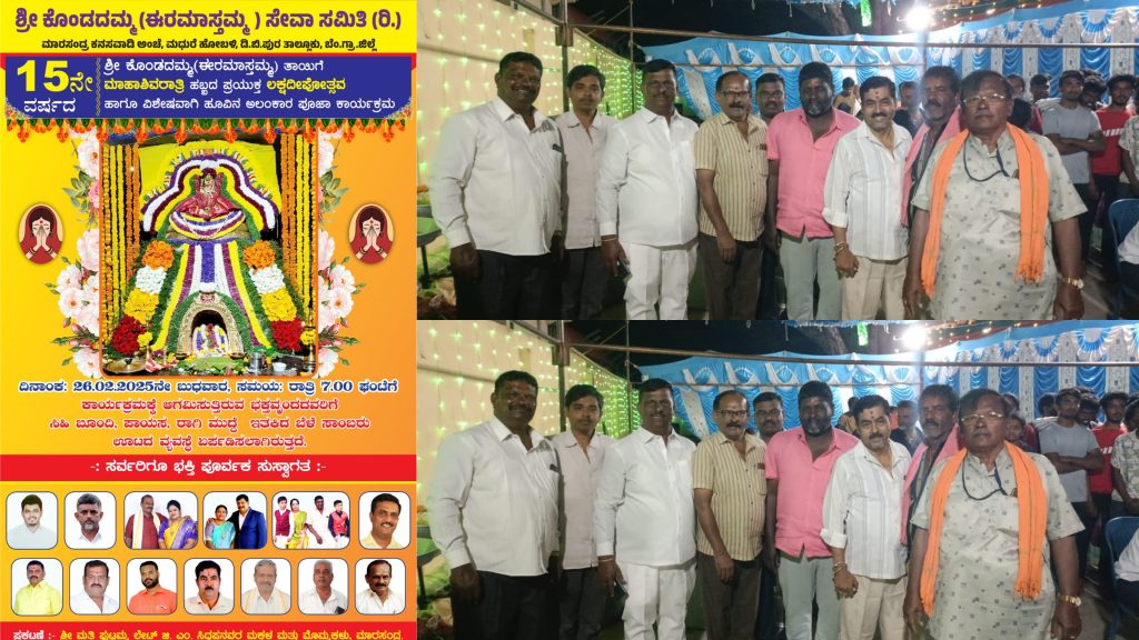 ತಾಲ್ಲೂಕಿನ ಮಧುರೆ ಹೋಬಳಿಯ ಮಾರಸಂದ್ರ ಗ್ರಾಮದ ಶ್ರೀ ಕೊಂಡದಮ್ಮ (ಈರಮಾಸ್ತಮ್ಮ) ಸೇವಾ ಸಮಿತಿ (ರಿ.)ವತಿಯಿಂದ 15ನೇ ವರ್ಷದ ಲಕ್ಷದೀಪೋತ್ಸವ ಹಾಗೂ ಕೊಂಡದಮ್ಮ (ಈರಮಾಸ್ತಮ್ಮ) ದೇವಿಗೆ ವಿಶೇಷವಾಗಿ ಹೂವಿನ ಅಲಂಕಾರ ಪೂಜಾ ಕಾರ್ಯಕ್ರಮ ನೆರವೇರಿಸಲಾಯಿತು.