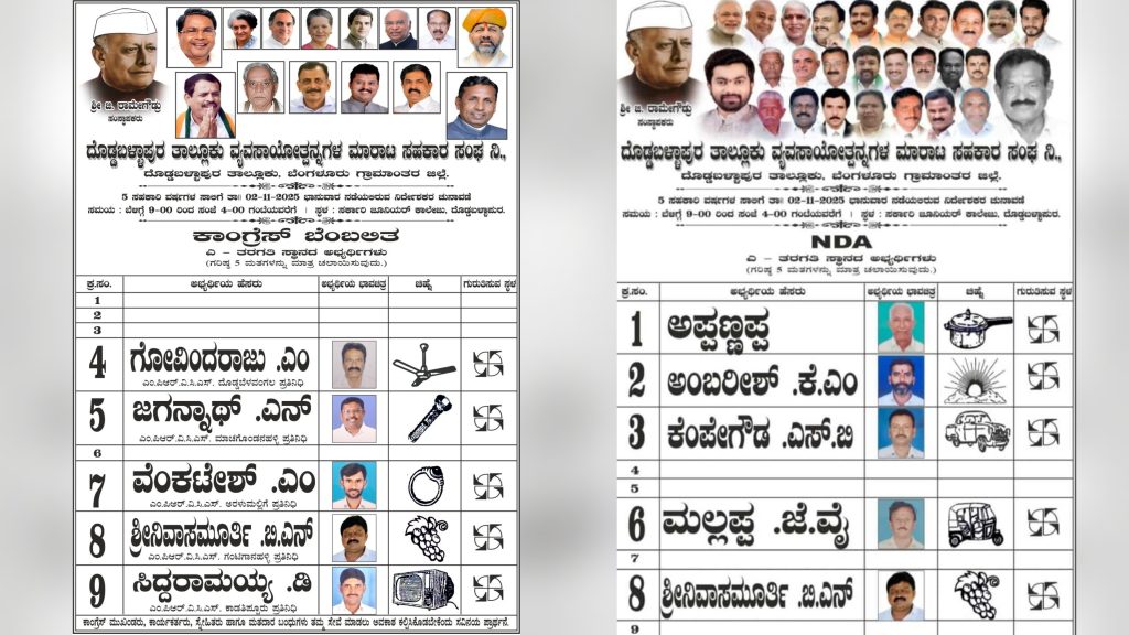 ದೊಡ್ಡಬಳ್ಳಾಪುರ : ಶ್ರೀನಿವಾಸ್ ಮೂರ್ತಿ ಯಾವ ಪಕ್ಷದ ಅಭ್ಯರ್ಥಿ ಎಂಬುದೇ ಗೊಂದಲಮಾಯವಾಗಿದೆ ಸ್ಥಳೀಯವಾಗಿ, ನವೆಂಬರ್ 02ರಂದು ನಡೆಯಲಿರುವ ದೊಡ್ಡಬಳ್ಳಾಪುರ ತಾಲೂಕು ವ್ಯವಸಾಯೋತ್ಪನ್ನ ಸಹಕಾರಿ ಸಂಘದ ಚುನಾವಣೆಯ ಎ ತರಗತಿ ಸ್ಥಾನದ ಅಭ್ಯರ್ಥಿ ಶ್ರೀನಿವಾಸ್ ಮೂರ್ತಿ.ಬಿ.ಎನ್ ಕಾಂಗ್ರೆಸ್ ಬೆಂಬಲಿತ ಮತ್ತು ಎನ್ ಡಿಎ ಕೂಟದ ಎರಡು ಕರಪತ್ರಗಳಲ್ಲಿ ಕಾಣಿಸಿಕೊಂಡಿರುವುದು ಮತದಾರರ ಗೊಂದಲಕ್ಕೆ ಕಾರಣವಾಗಿದೆ.